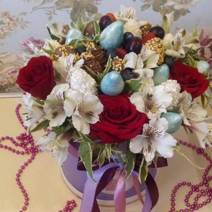 Клубника в шоколаде – 22 шт.Голубика – 15 шт.Альстромерия – 5 шт.розы алые 60 см – 5 шт.зелень декоративная – 10 шт.Шляпная коробка – 1 шт.Дизайнерская упаковка – 1 шт.