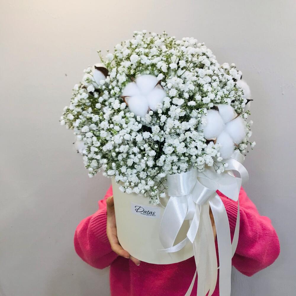 Гипсофила – 10 шт.Лента – 1 шт.Хлопок – 7 шт.биафлора – 1 шт.шляпная коробка d16 см – 1 шт.