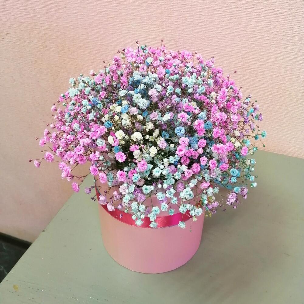 Коробка шляпная – 1 шт.Оазис флористический – 1 шт.гипсофила радужная – 6 шт.