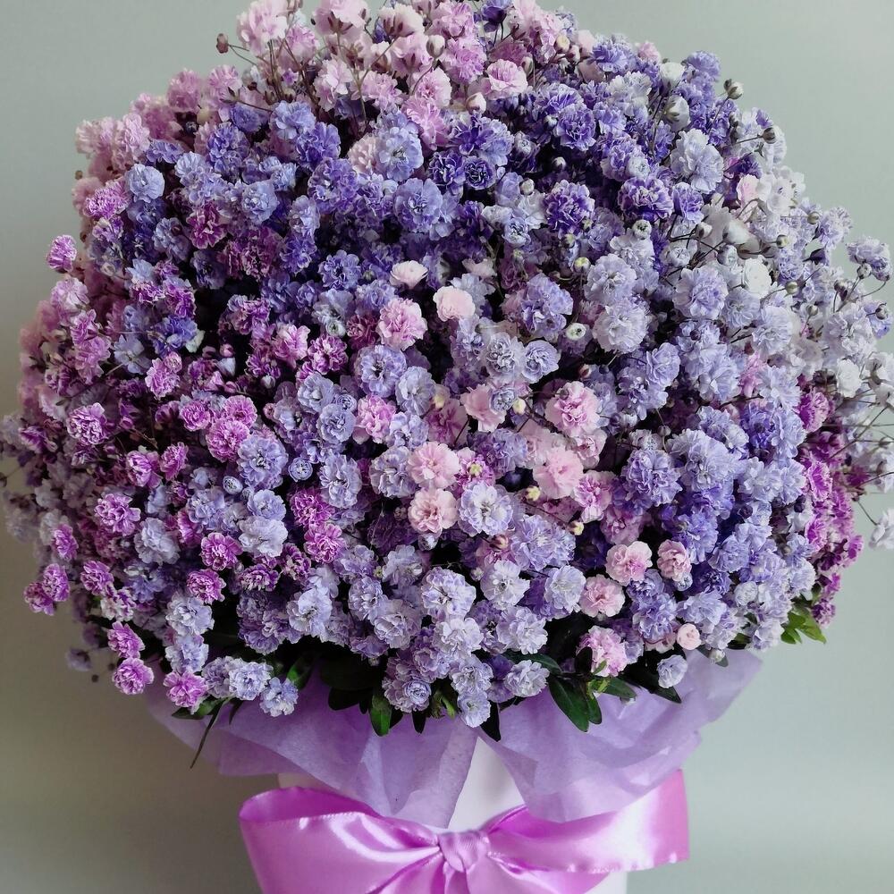 Гипсофила – 8 шт.Лента атласная – 1 шт.Тишью – 1 шт.Фисташка – 1 шт.Оазис флористический – 1 шт.шляпная коробка без крышки – 1 шт.