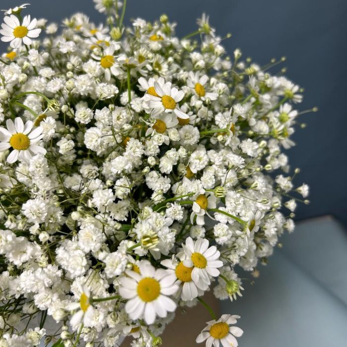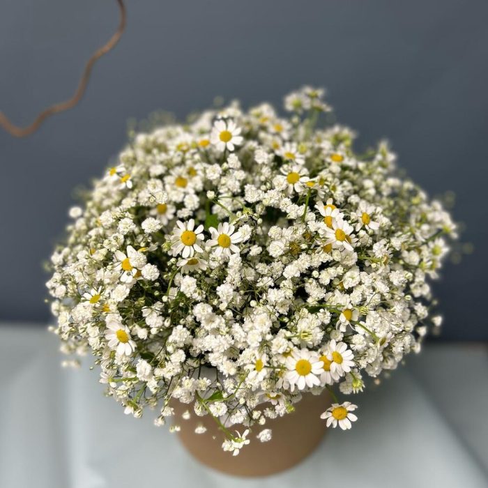 Матрикария – 3 шт.Гипсофила – 5 шт.Коробка шляпная – 1 шт.Оазис флористический – 1 шт.Тишью – 1 шт.