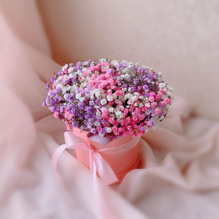 Шляпная коробка с лентой – 1 шт.Флористическая губка – 1 шт.радужная гипсофила – 5 шт.