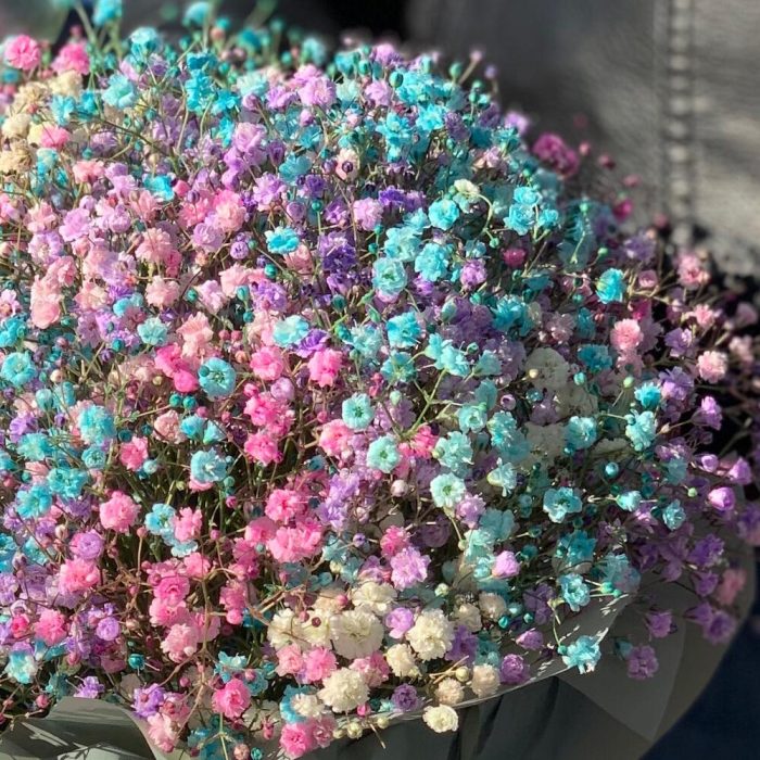 гипсофила радужная – 10 шт.Коробка шляпная – 1 шт.Оазис флористический – 1 шт.