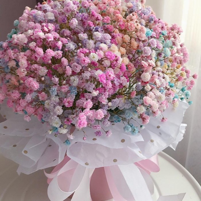 Радужная гипсофила в картонном цилиндре всегда популярна! Ее дарят в качестве подарка для маленькой девочки, на первое свидание, на День рождения жены или мамы! Разноцветные шарики поднимут настроение и украсят любой праздник. После высыхания радужная гипсофила превратится в сухоцветы и будет радовать любимого человека ещё долгое время Как ухаживать за цветами на флористической губке* Следите, чтобы флористическая губка всегда была влажной.* Ежедневно подливайте воду на губку между цветами.* Используйте только прохладную воду. Теплая или слишком холодная вода отрицательно сказывается на состоянии срезанных цветов.* Следите за тем, чтобы букет был вдали от сквозняков, прямых солнечных лучей, а также источников тепла (каминов, батарей). Также нежелательно ставить букет рядом с фруктами и овощами.