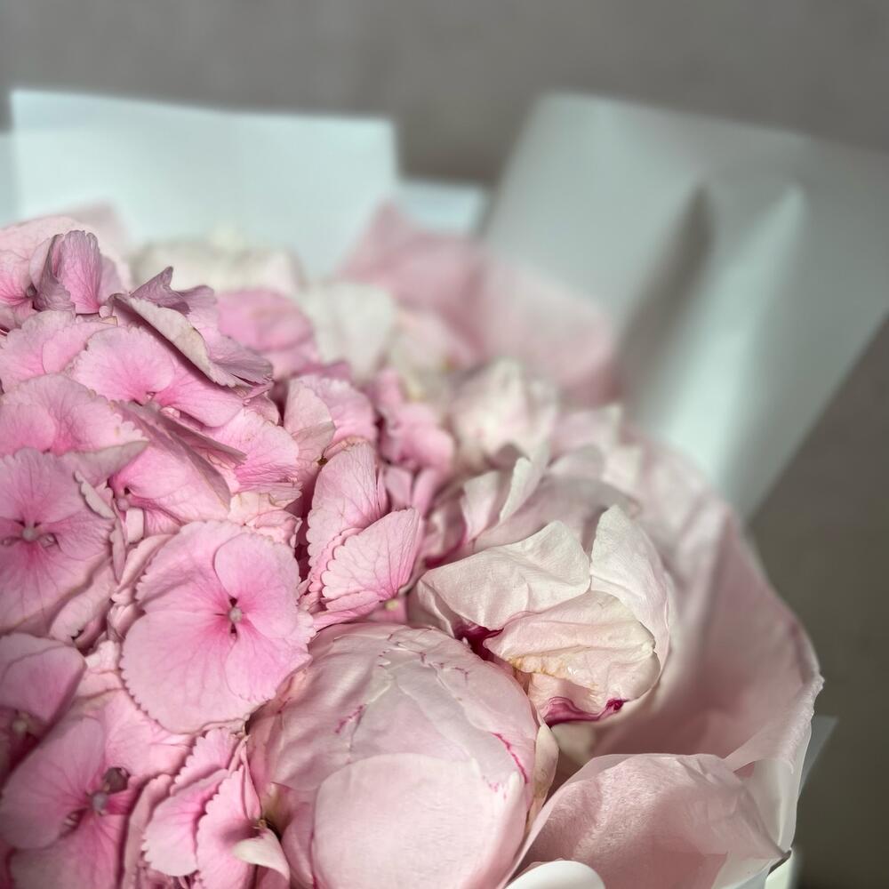 Гортензия – 1 шт.Атласная лента – 1 шт.декоративная упаковка – 1 шт.пионы – 5 шт.