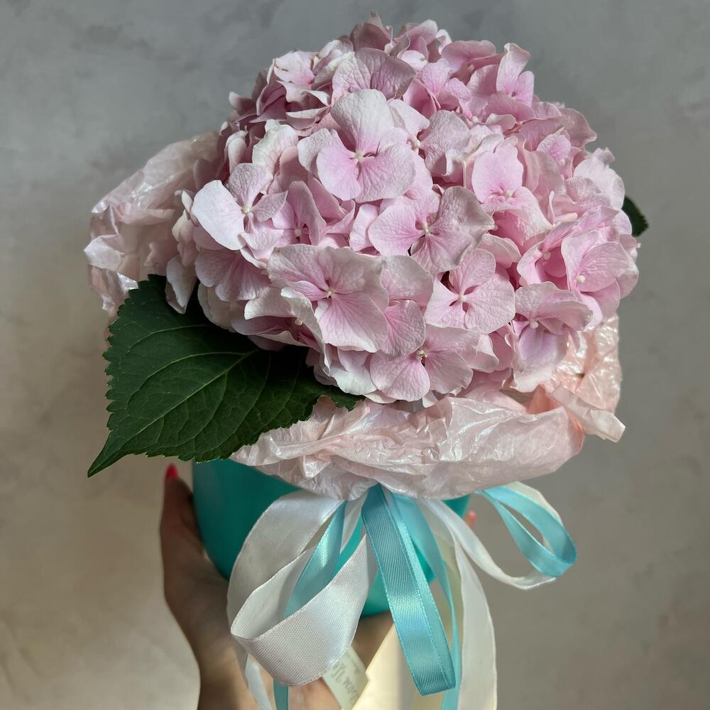 шляпная коробочка s – 1 шт.Тишью – 1 шт.Атласная лента – 1 шт.Гортензия – 1 шт.