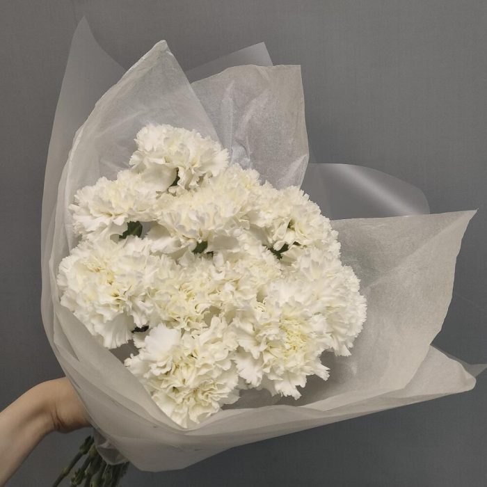 Гвоздика белая – 11 шт.Тишью – 1 шт.Пленка матовая – 1 шт.