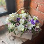 Хризантема кустовая – 2 шт.Хризантема кустовая ромашка – 1 шт.эустома белая – 2 шт.эустома сиреневая – 1 шт.Фисташка – 2 шт.Бокс деревянный – 1 шт.Оазис – 1 шт.