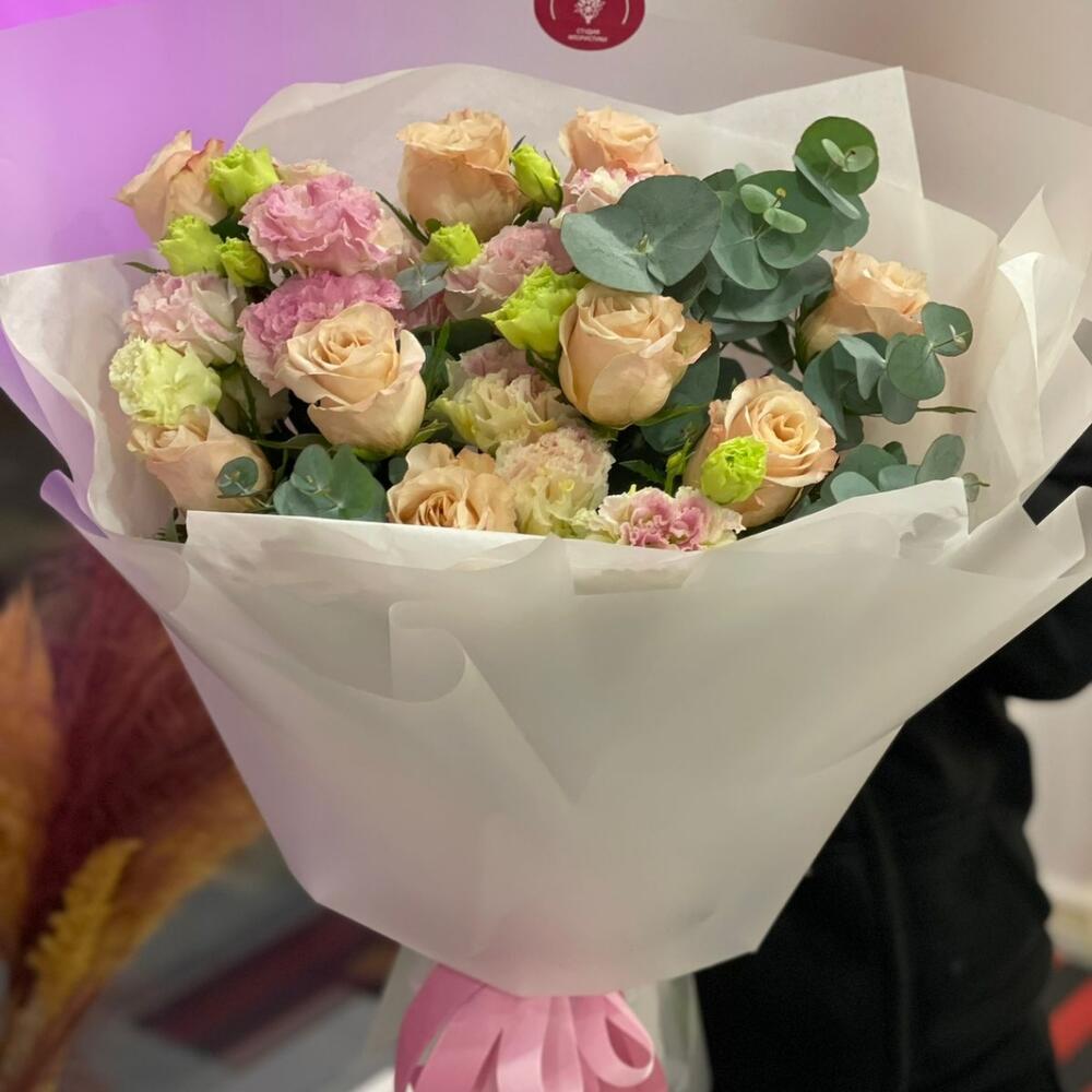 Гвоздики, Лизиантусы, Розы, Тюльпаны