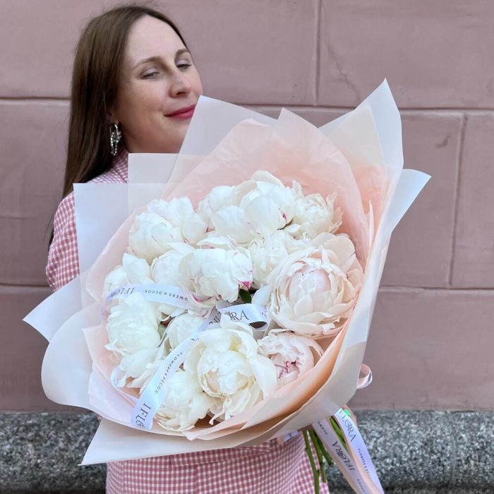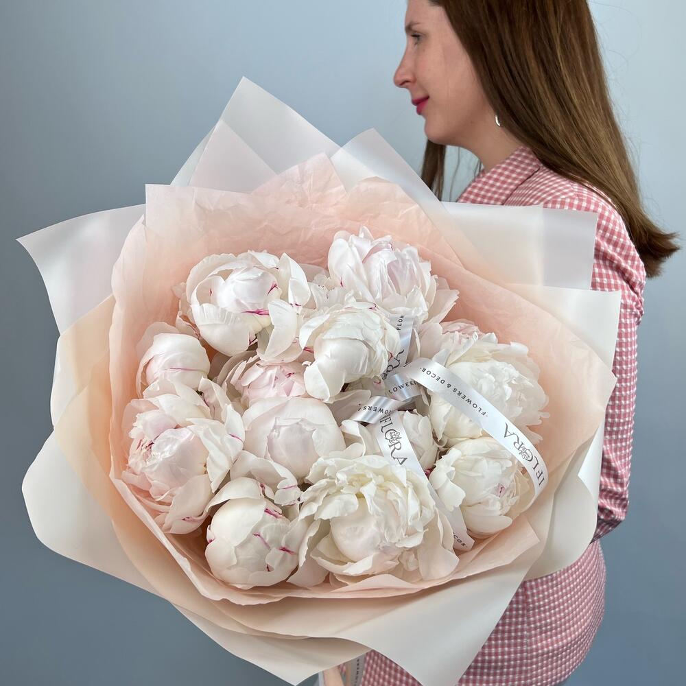 Пион – 15 шт.Лента атласная – 3 шт.Дизайнерская упаковка – 1 шт.