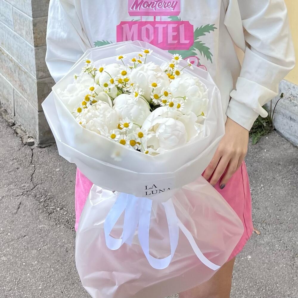 Лента атласная – 1 шт.Матрикария – 4 шт.Упаковка дизайнерская – 1 шт.Кризал (подкормка) – 1 шт.Аквапак – 1 шт.Транспортировочная коробка – 1 шт.инструкция по уходу за цветами – 1 шт.пион madame claude tain – 7 шт.