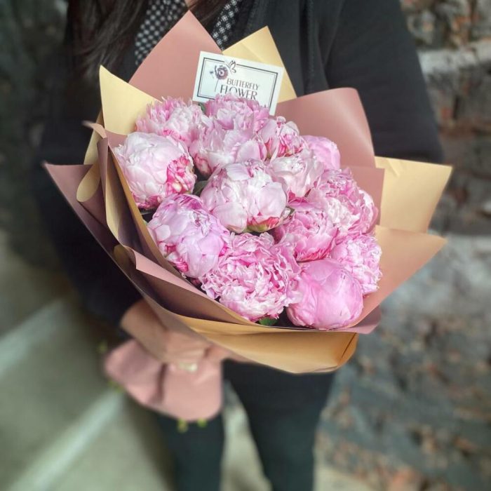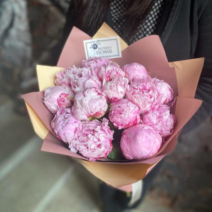 Букет из 15 розовых пионов в дизайнерской упаковке “Принцесса Маргарита”