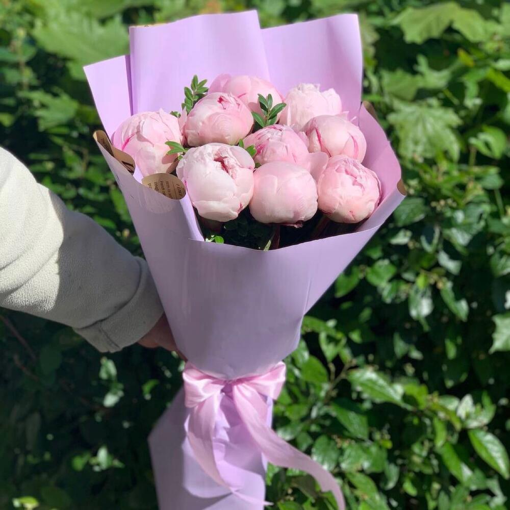 Букет розовых пионов в дизайнерской упаковке 9 шт