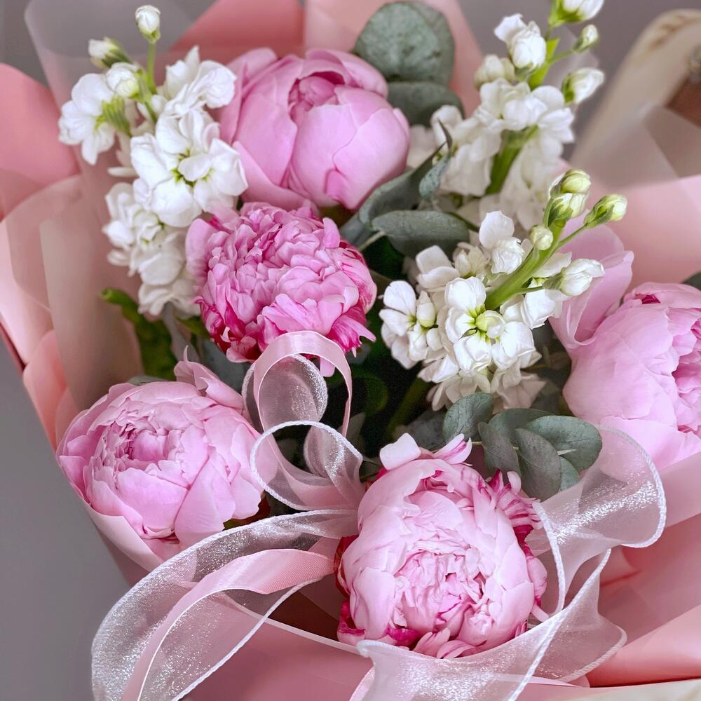 розовые пионы сара бернар – 5 шт.белая маттиола – 3 шт.Эвкалипт – 1 шт.Упаковка дизайнерская – 1 шт.
