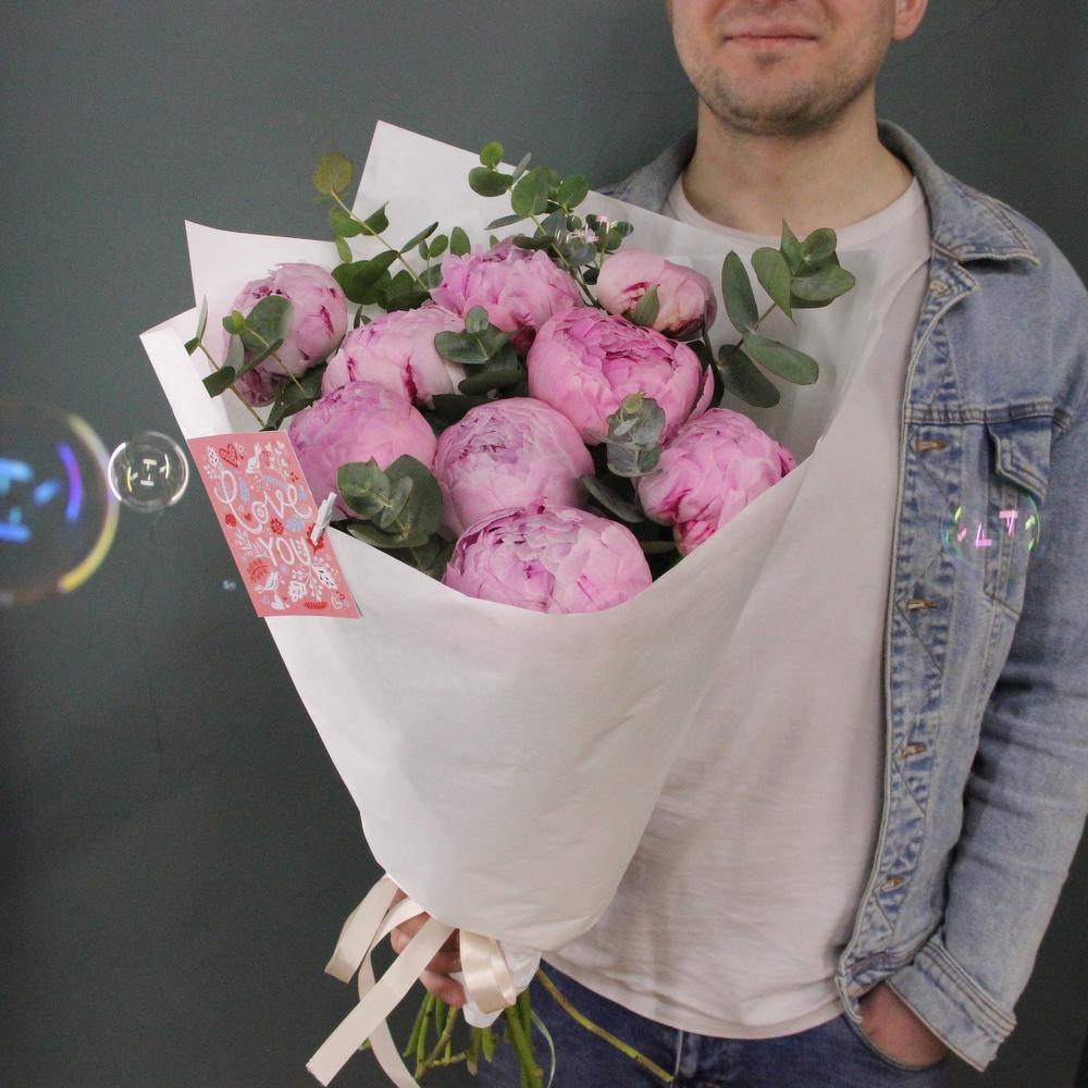 Букет из 9 розовых пиона светляку ароматного эвкалипта, в лаконичной упаковке.Стильное цветочное решение для любого случая.