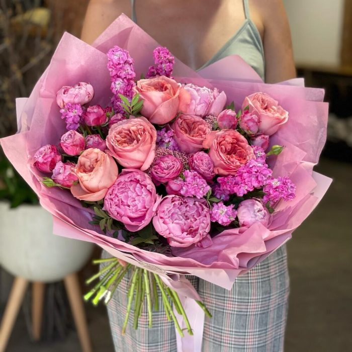 Маттиола – 7 шт.Роза кустовая пионовидная – 3 шт.Пион Сара Бернар – 4 шт.Упаковка дизайнерская – 1 шт.роза пинк экспрешн – 4 шт.