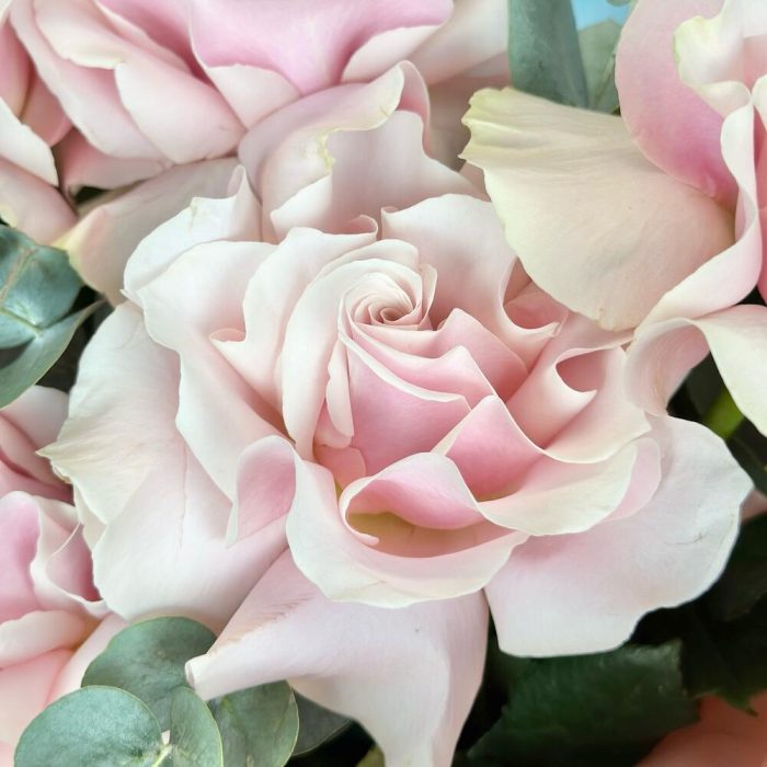 Лента атласная – 1 шт.Французская роза – 5 шт.Дизайнерская упаковка – 1 шт.эвкалипт цинерея пучок – 1 шт.влагостойкий тишью – 1 шт.