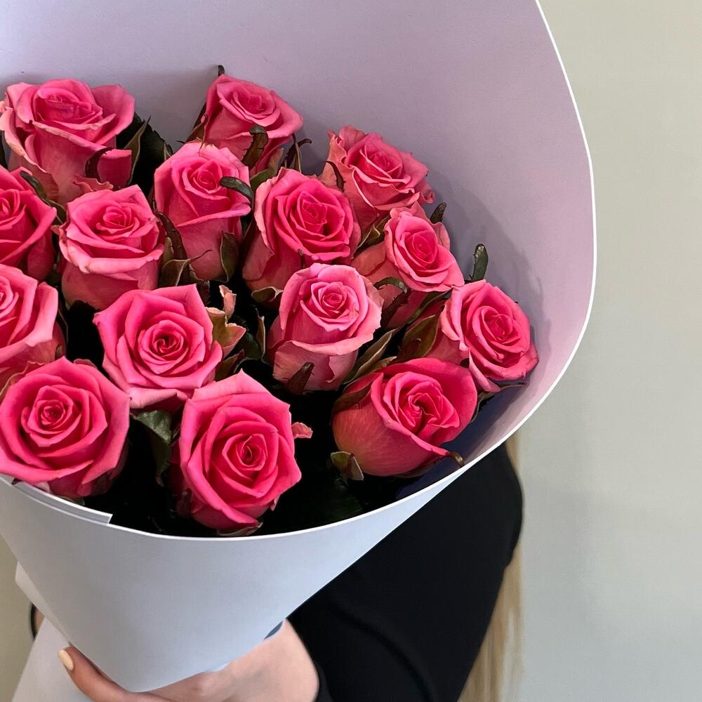 Роза – 15 шт.Лента атласная – 1 шт.Упаковка дизайнерская – 1 шт.