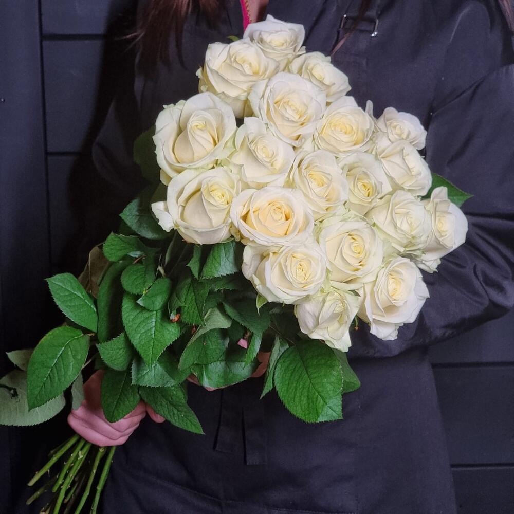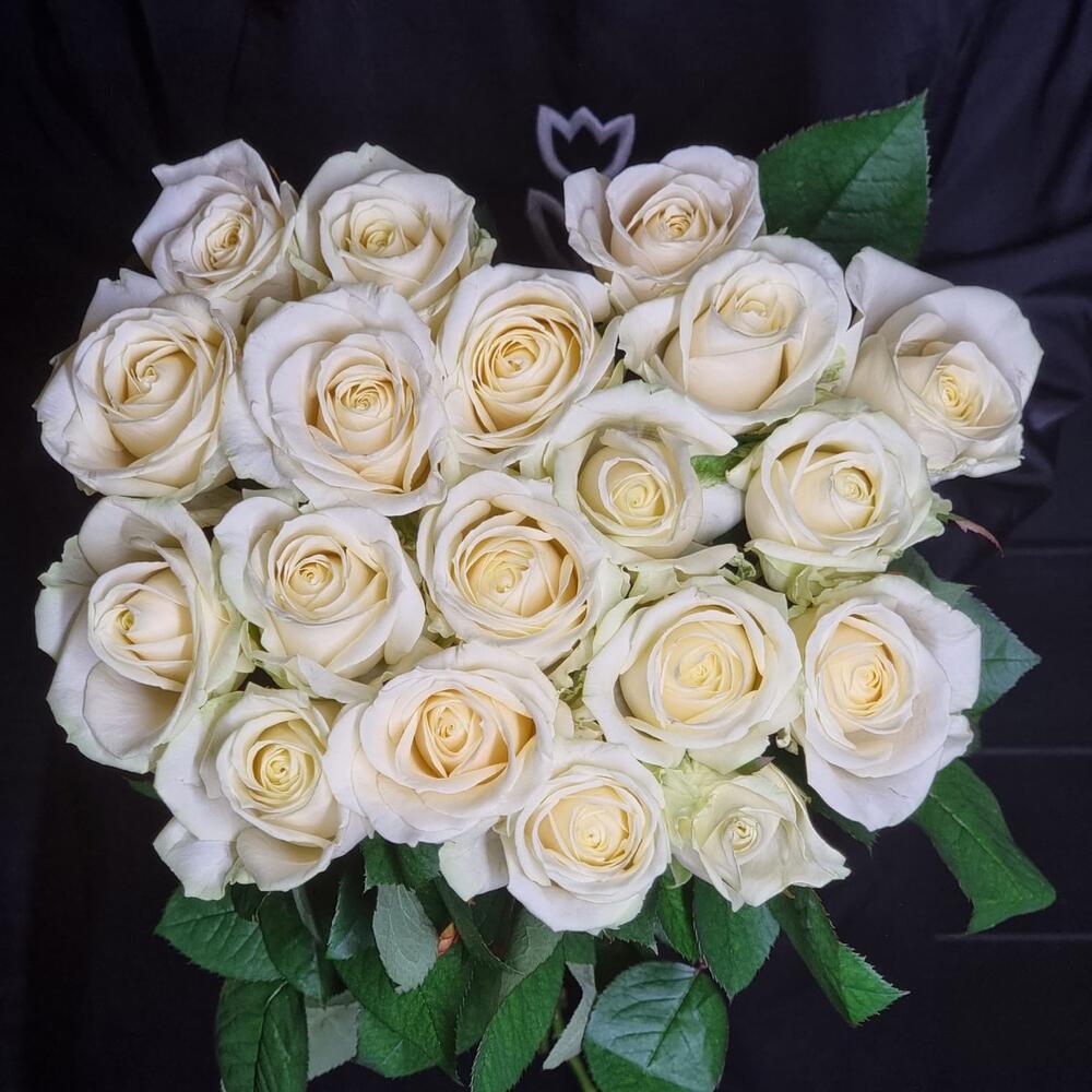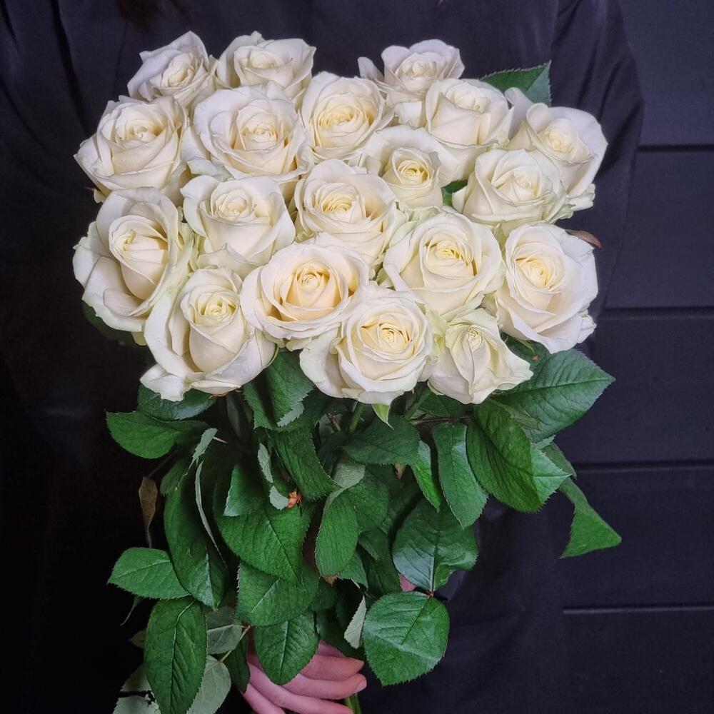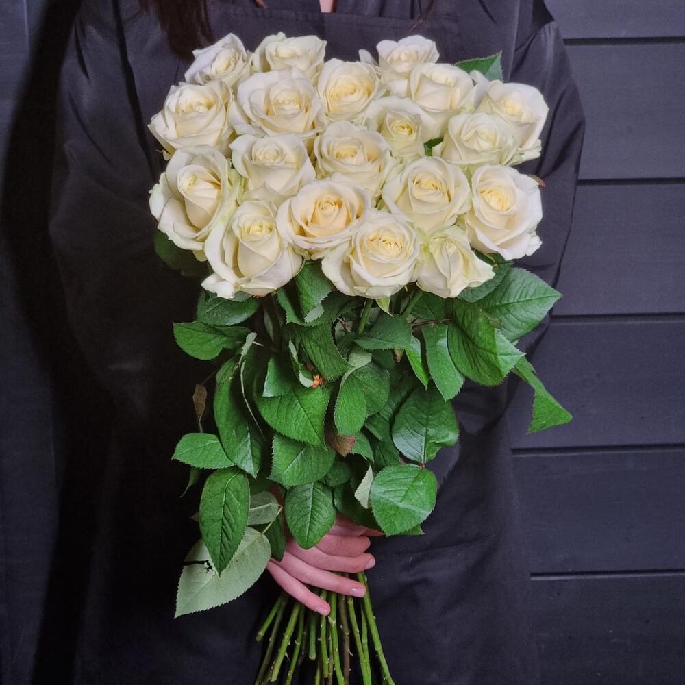 Лента атласная – 1 шт.Роза 50 см – 19 шт.Пленка прозрачная – 1 шт.