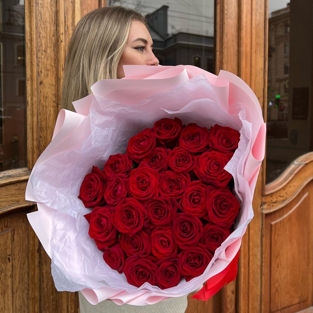 Роза красная 60 см – 19 шт.Тишью – 2 шт.Дизайнерская упаковка – 5 шт.Лента атласная – 2 шт.