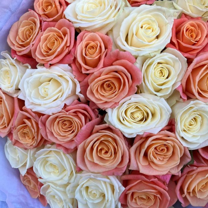 Роза белая 60 см – 16 шт.Роза коралловая 60 см – 19 шт.Дизайнерская упаковка – 3 шт.Тишью – 5 шт.Лента атласная – 2 шт.