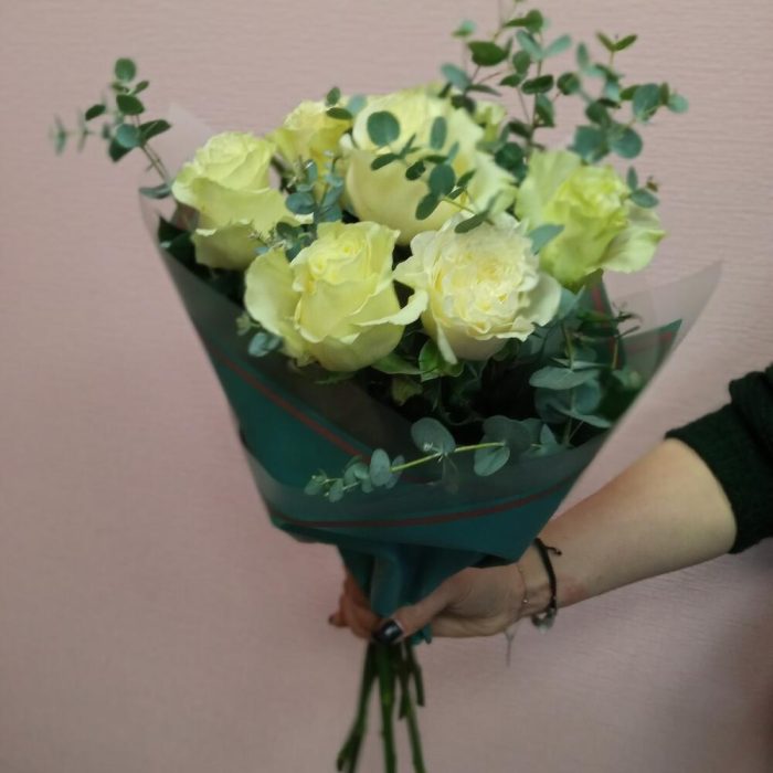Лента – 1 шт.Эвкалипт – 5 шт.Роза Эквадор – 7 шт.Упаковка – 1 шт.