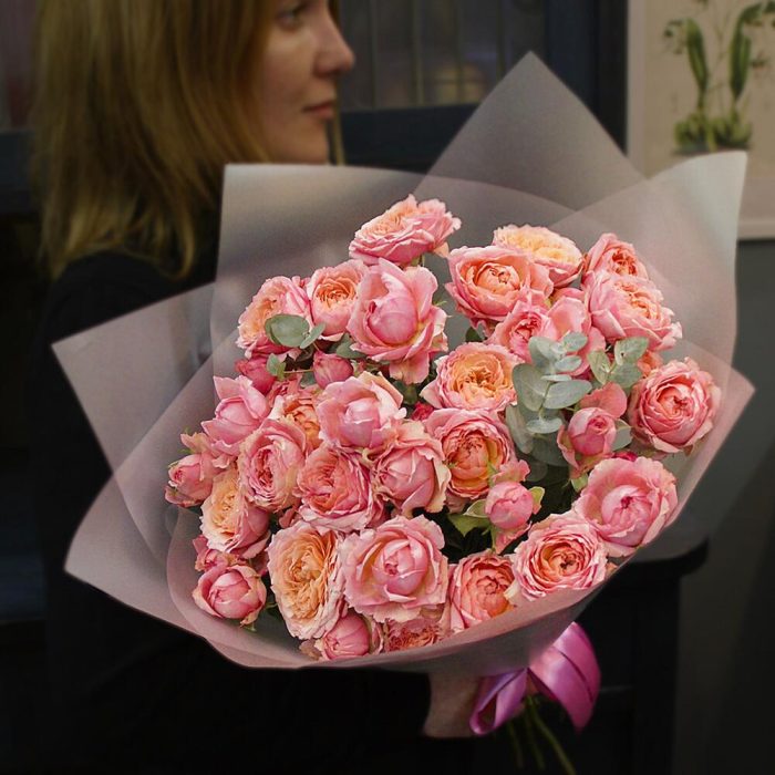 Эвкалипт – 2 шт.Атласная лента – 2 шт.Матовая пленка – 2 шт.Роза кустовая джульетта – 9 шт.