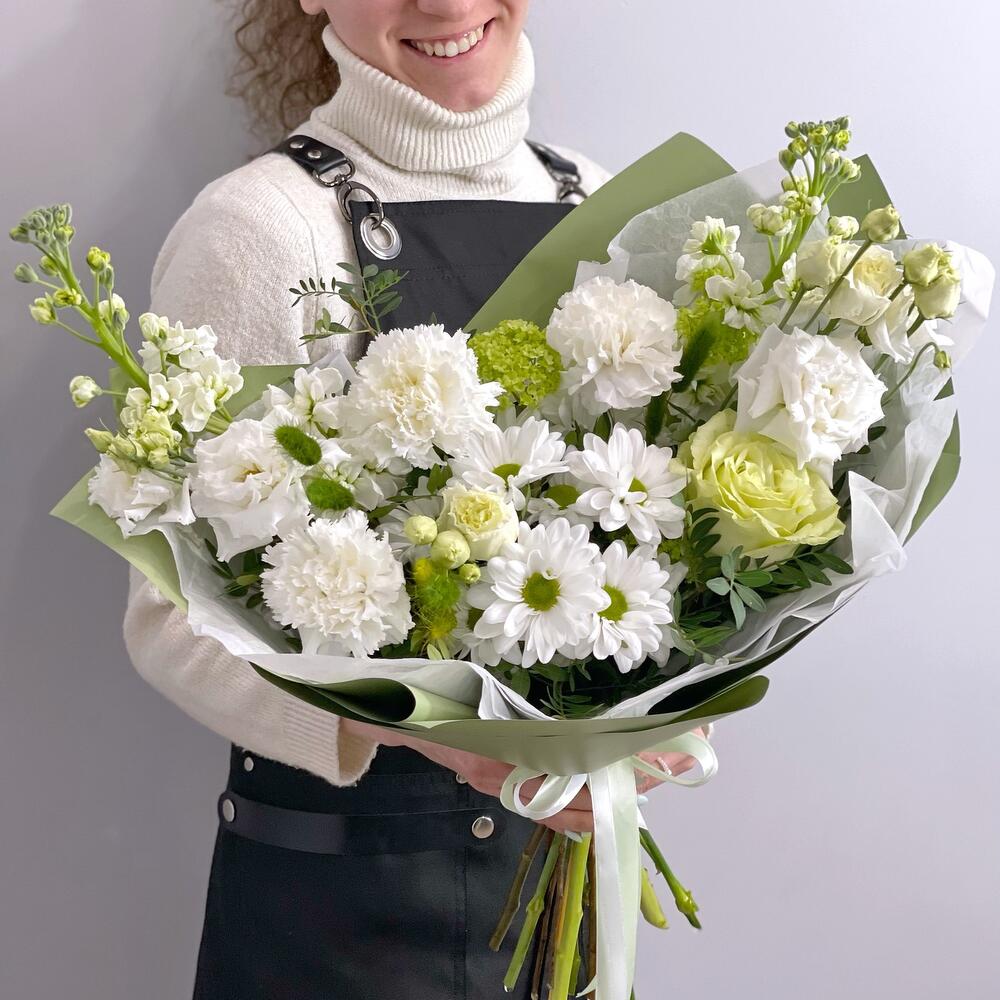 Роза Эквадор – 1 шт.Гвоздика – 3 шт.Вибурнум – 1 шт.Хризантема кустовая – 2 шт.Маттиола – 2 шт.Лизиантус – 2 шт.Лагурус – 7 шт.Фисташка – 1 шт.Упаковка дизайнерская – 1 шт.
