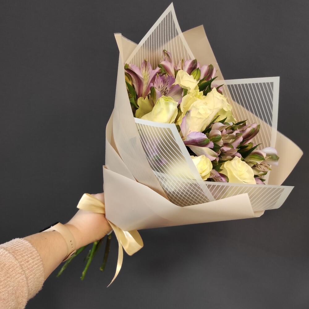 Роза – 7 шт.Альстромерия – 5 шт.Пленка матовая – 2 шт.Лента атласная – 1 шт.