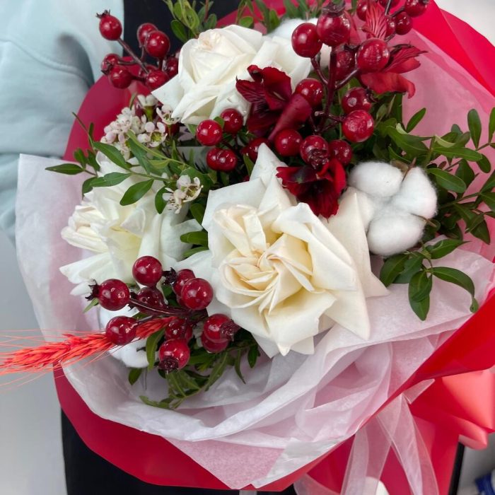 Альстромерия – 1 шт.Роза Охара – 3 шт.Пленка матовая – 6 шт.Хлопок натуральный – 3 шт.Хамелациум белый – 1 шт.фиисташка – 5 шт.ягода декор – 5 шт.