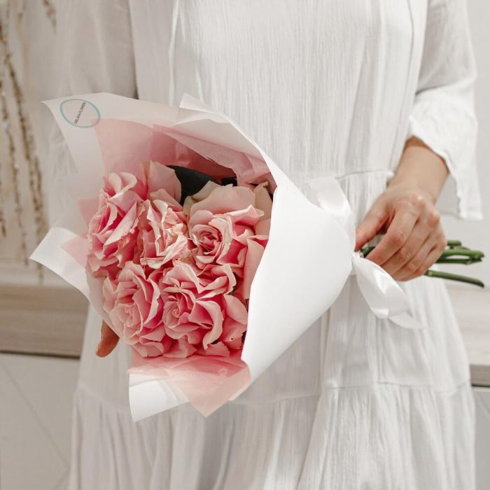 Роза французская – 5 шт.Тишью – 2 шт.Корейская пленка – 2 шт.Лента атласная – 1 шт.инструкция по уходу за цветами – 1 шт.Пакет крафтовый – 1 шт.