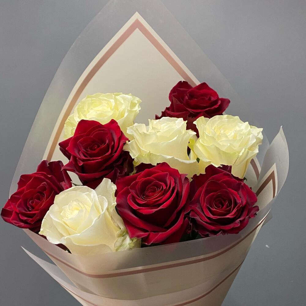 Роза – 9 шт.Упаковка дизайнерская – 2 шт.Лента атласная – 1 шт.