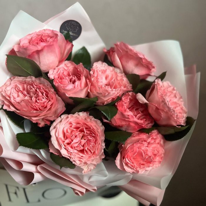 Атласная лента – 1 шт.декоративная упаковка – 1 шт.пионовидная одноголовая роза mayra pink – 9 шт.