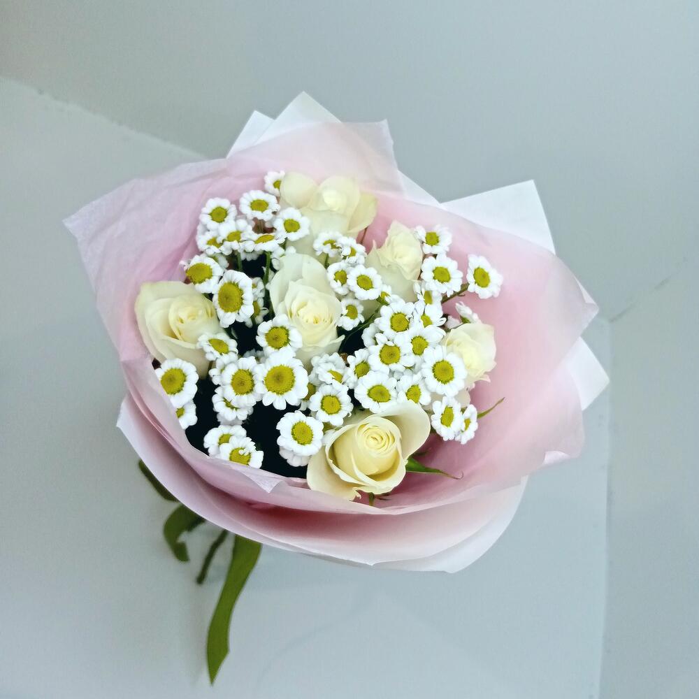 роза кения – 6 шт.Хризантема кустовая Сантини – 3 шт.Дизайнерская упаковка – 1 шт.