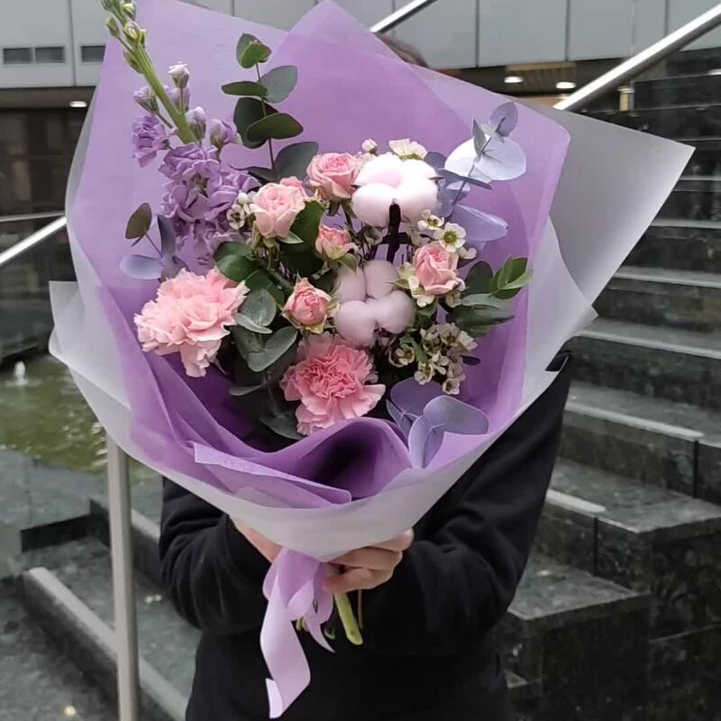 Роза кустовая – 1 шт.Диантус – 2 шт.Хлопок – 2 шт.Маттиола – 1 шт.Эвкалипт – 1 шт.Ваксфлауэр – 1 шт.Лента – 2 шт.Упаковка дизайнерская – 2 шт.