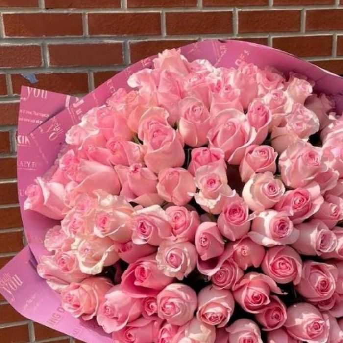 Роза розовая – 101 шт.Упаковка дизайнерская – 1 шт.Лента атласная – 2 шт.Открыточка с вашими пожеланиями – 1 шт.инструкция по уходу за цветами – 1 шт.хорошее настроение – 100 шт.коробка переноска – 1 шт.Кризал – 1 шт.