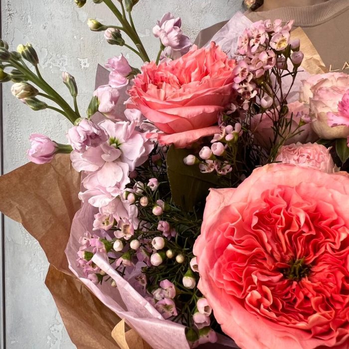 Роза пионовидная – 3 шт.Роза пионовидная кустовая – 2 шт.Гвоздика – 3 шт.Маттиола – 2 шт.Ваксфлауэр – 3 шт.Лизиантус – 1 шт.Упаковка дизайнерская – 1 шт.