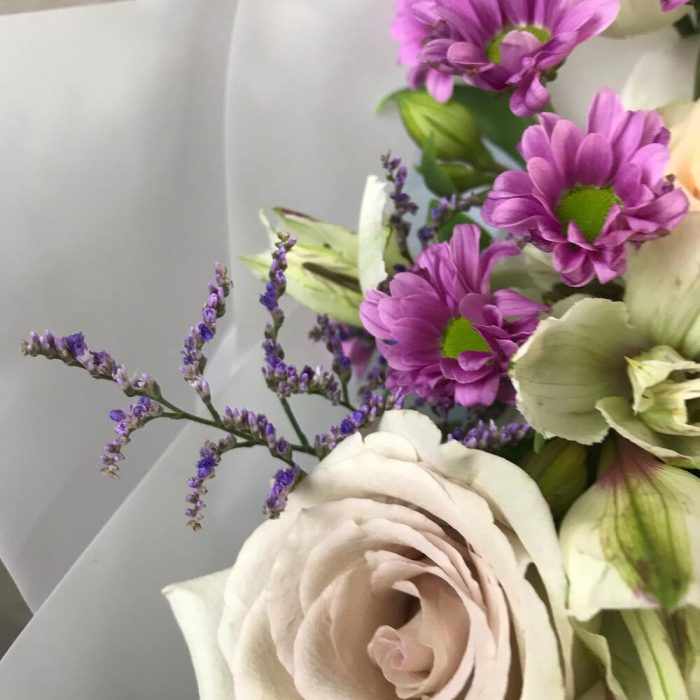 Лизиантус – 3 шт.Лимониум – 2 шт.Роза кустовая – 3 шт.Хризантема кустовая – 4 шт.Роза – 3 шт.Хиперикум – 3 шт.Упаковка дизайнерская – 2 шт.