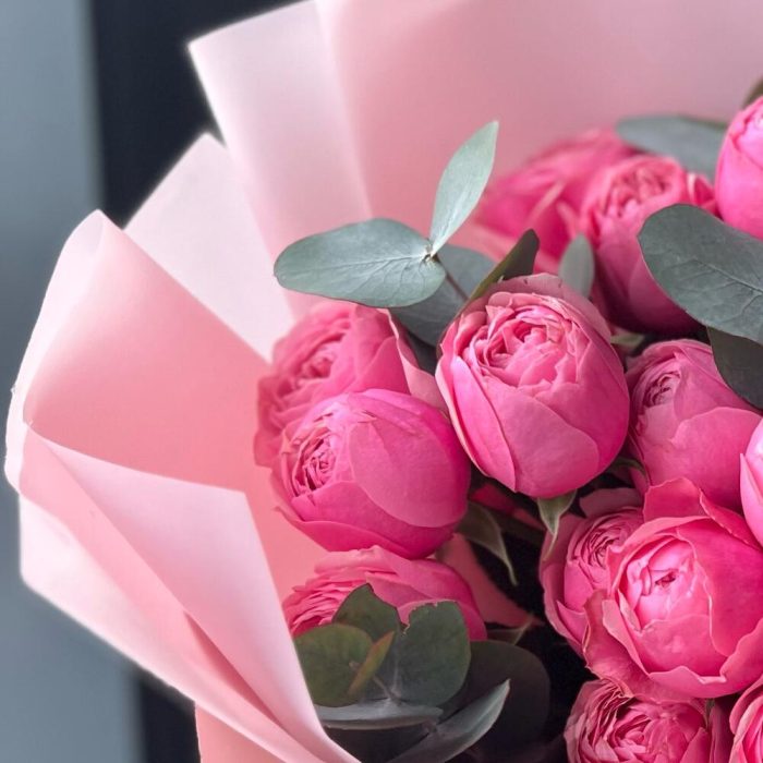 Кустовая пионовидная роза – 5 шт.Эвкалипт – 5 шт.декоративная упаковка – 1 шт.Атласная лента – 1 шт.