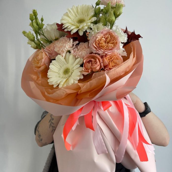Салал – 2 шт.Эустома – 2 шт.Лента атласная – 2 шт.Гербера – 2 шт.Диантус – 3 шт.Упаковка дизайнерская – 2 шт.Листья Дуба – 1 шт.джульетта кустовая роза пионовидная – 2 шт.