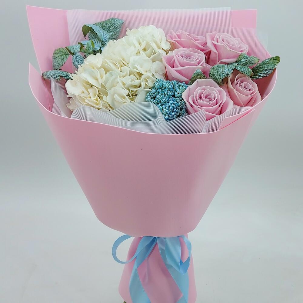 Гортензия – 1 шт.Озотамнус – 1 шт.Роза Эквадор – 5 шт.Упаковка дизайнерская – 1 шт.рубус зелень – 5 шт.
