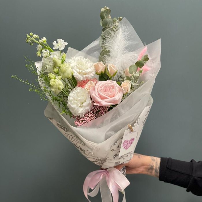 Лента – 1 шт.Лизиантус – 1 шт.Маттиола – 1 шт.Озотамнус – 1 шт.Роза кустовая – 1 шт.Эвкалипт – 1 шт.Роза одноголовая – 1 шт.Открытка – 1 шт.Гринбелл – 1 шт.Упаковка дизайнерская – 1 шт.Перо – 2 шт.Лагурус (сухоцвет) – 3 шт.Гвоздика одноголовая – 1 шт.