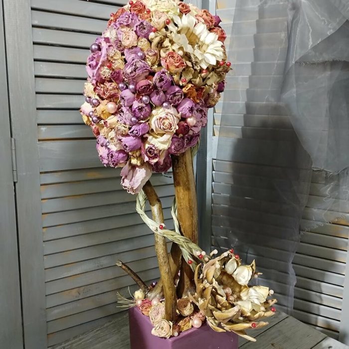 коряга – 3 шт.натуральный засушеный берграсс – 2 шт.засушеная протея – 2 шт.Кашпо керамическое – 1 шт.жемчужена искусственная – 76 шт.натуральная засушеная роза – 1 шт.