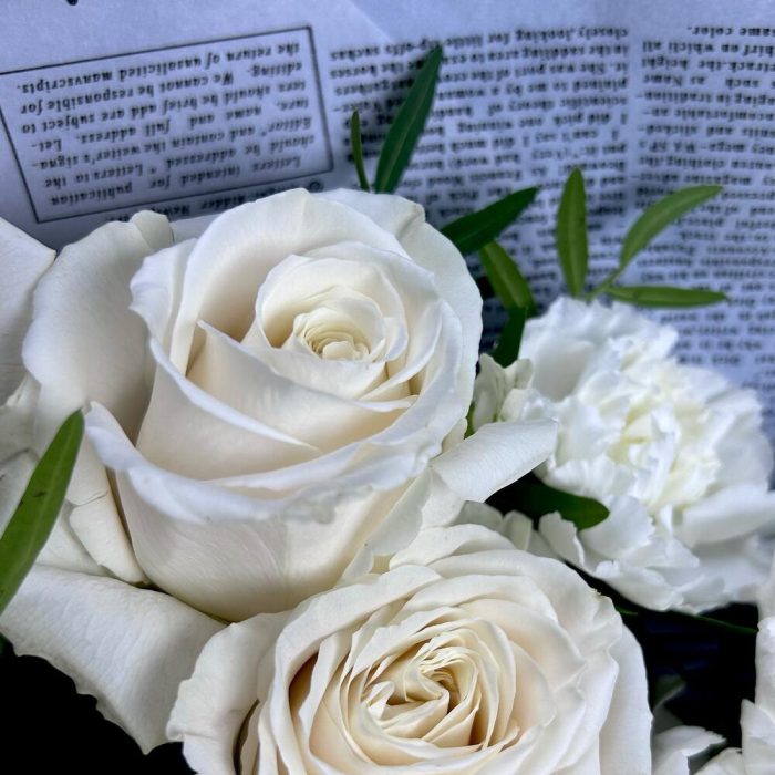 Гвоздика одноголовая – 6 шт.роза премиальная пионовидная «плая бланка» – 5 шт.Лагурус (сухоцвет) – 3 шт.Фисташка – 3 шт.Упаковка дизайнерская – 1 шт.