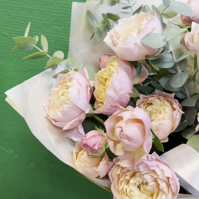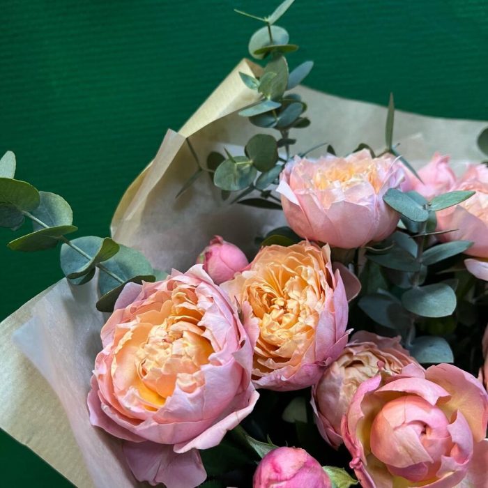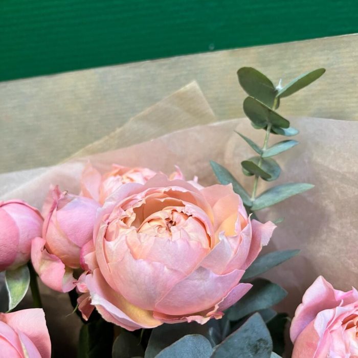 эвкалипт цинарея – 7 шт.Лента атласная нежно-розовая – 4 шт.Роза кустовая пионовидная джульетта – 5 шт.упаковка натуральный крафт – 1 шт.тишью нежно-розовое – 1 шт.