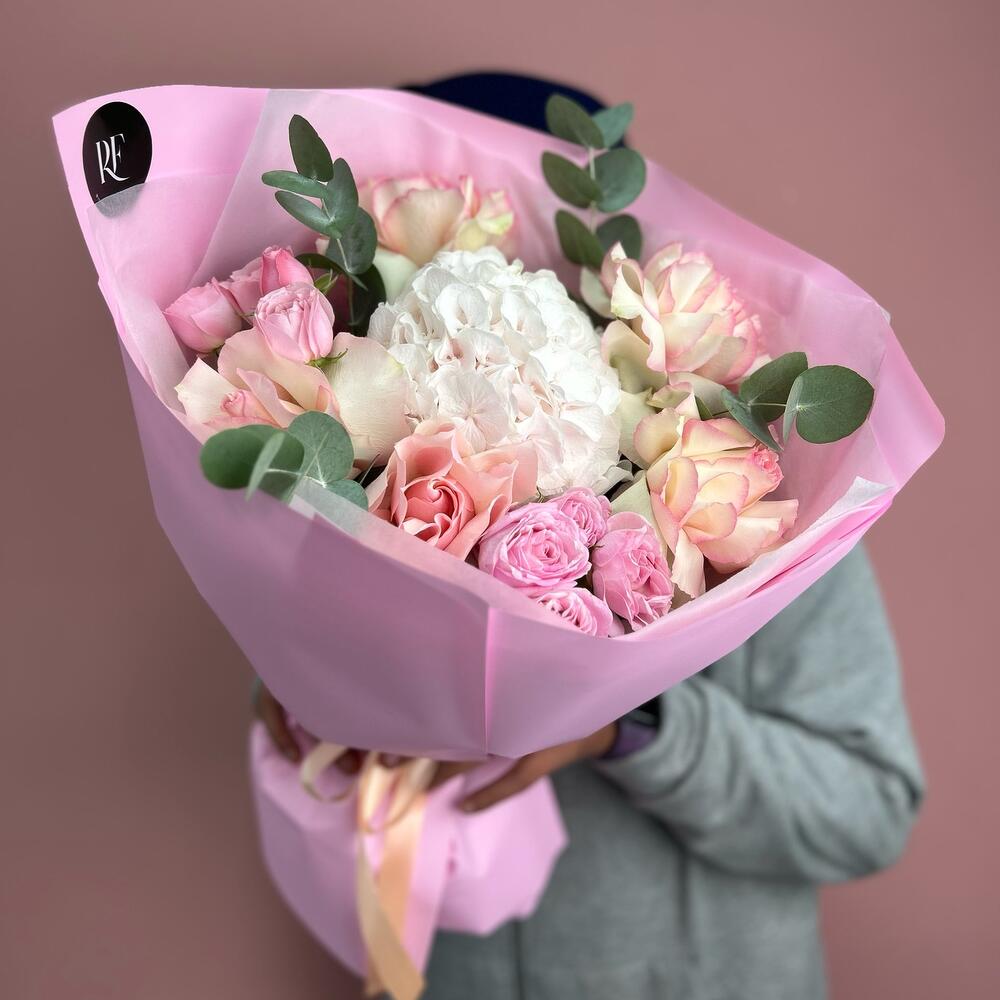 Альстромерии, Гвоздики, Кустовые розы, Лизиантусы, Розы, Хризантемы