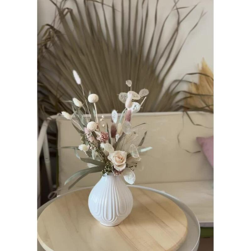Композиция из сухоцветов и стабилизированных цветов в белом бетонном кашпо