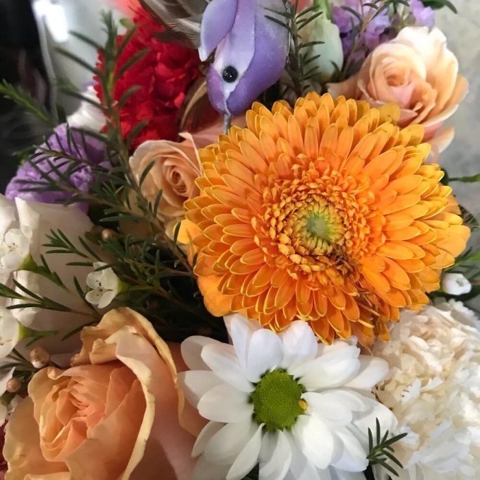 Ваксфлауэр – 2 шт.Статица – 3 шт.Хризантема кустовая – 1 шт.Роза – 5 шт.Гвоздика – 2 шт.Гербера – 1 шт.Ранункулюс – 1 шт.Птица декоративная – 1 шт.Ящик деревянный – 1 шт.фисташкв – 3 шт.декор трава – 5 шт.