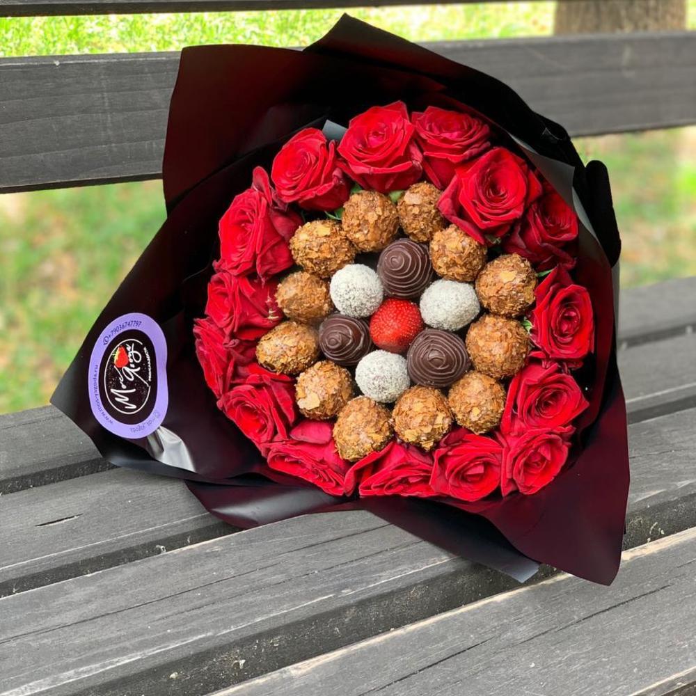 Клубника – 1 шт.Клубника в шоколаде callebaut (бельгия) – 19 шт.Роза – 9 шт.