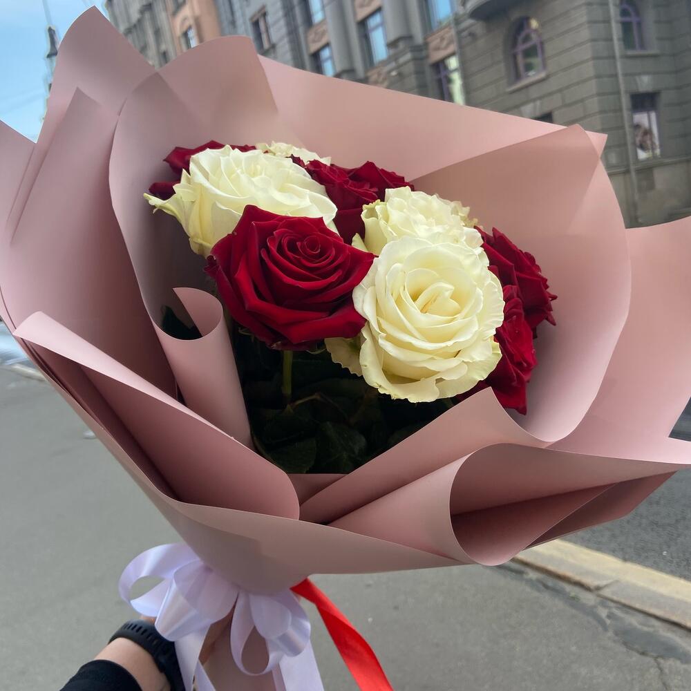 Роза Эквадор – 11 шт.Лента атласная – 1 шт.Упаковка дизайнерская – 1 шт.